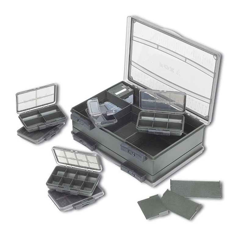 Fox F-Box Deluxe Set – Medium Double is een slimme box met veel verschillende opbergvakken voor al je karpervisbenodigdheden.