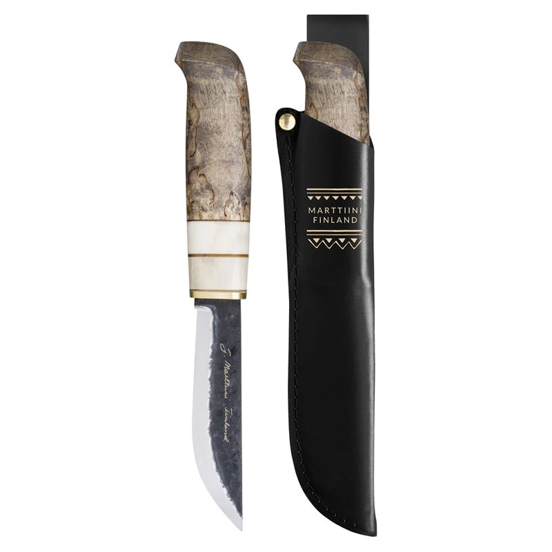 Aapa Carbon van Marttiini is een ongelooflijk fijn stukje vakmanschap verpakt in een prachtig mes. Zwart lederen schede met gouden details.